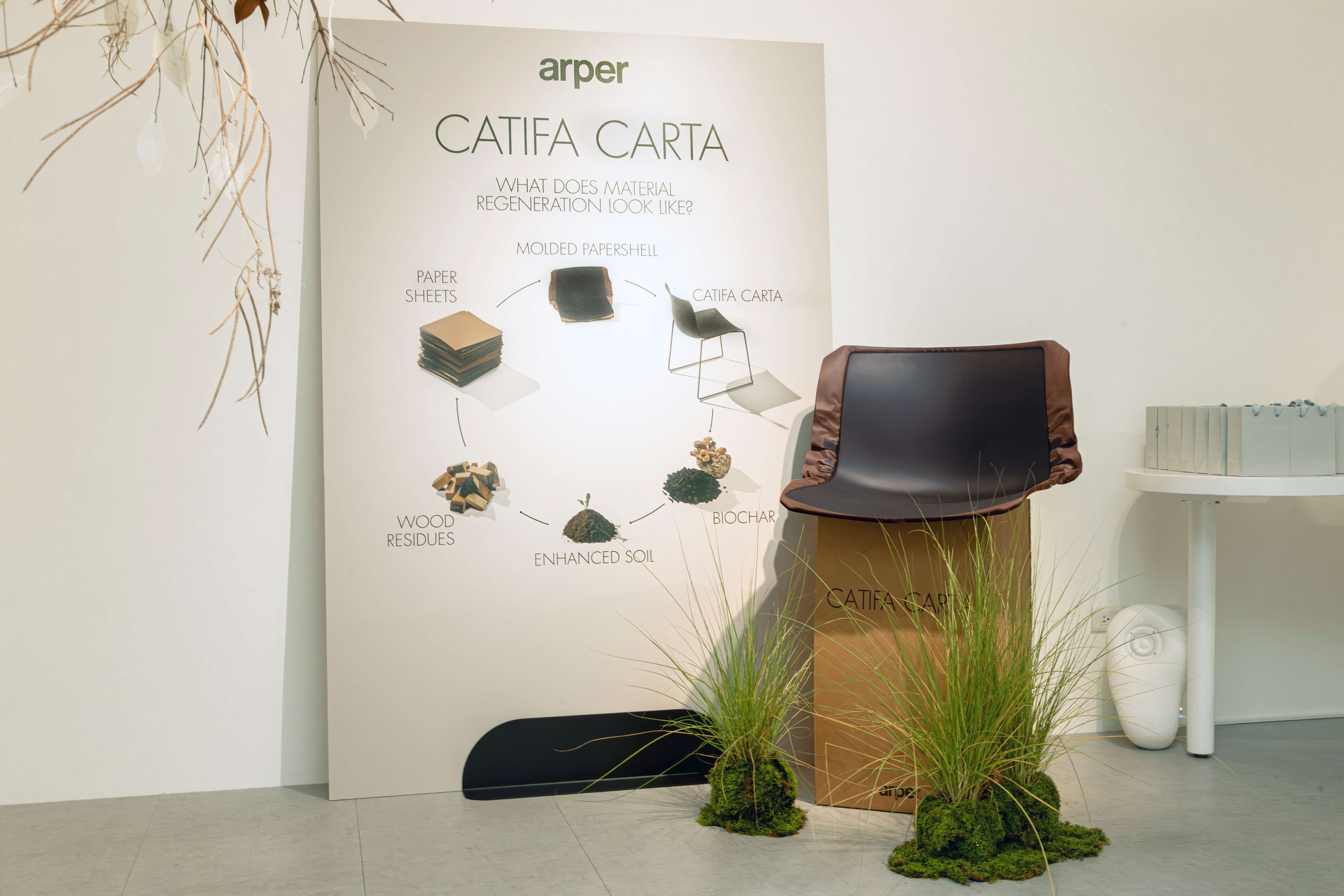 在這樣的氛圍中,Arper的Catifa Carta單椅成為組成畫面的重要存在,Catifa Carta單椅利用29張牛皮紙壓製而成,是目前市面上唯一達到「負碳排」的單椅,象徵Arper對「自然循環」與「設計永續」的具體實踐──取自自然,最終回歸自然。椅身輕盈卻堅韌的材質呼應畫布織理,使家具與繪畫不再只是並置,而是相互映襯。